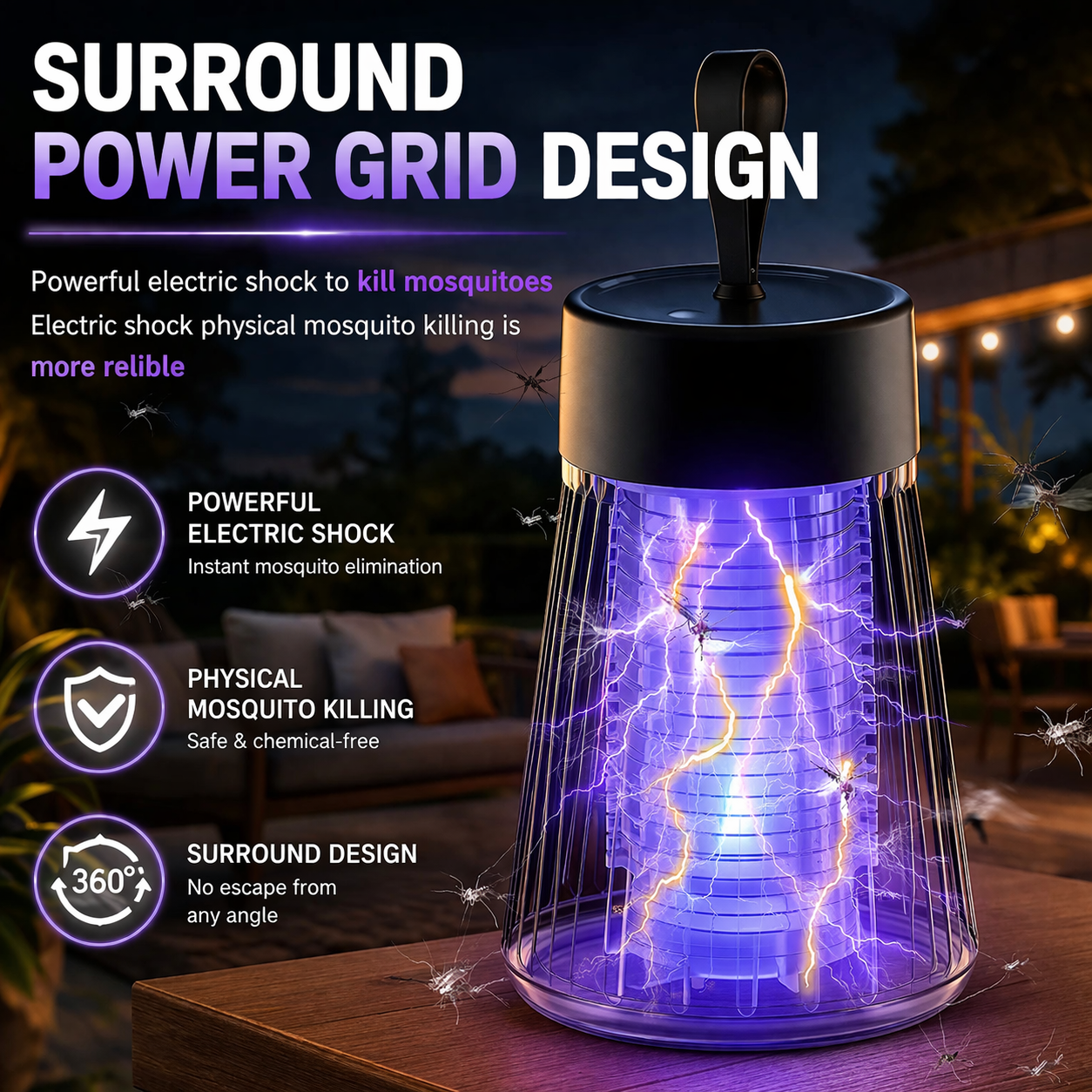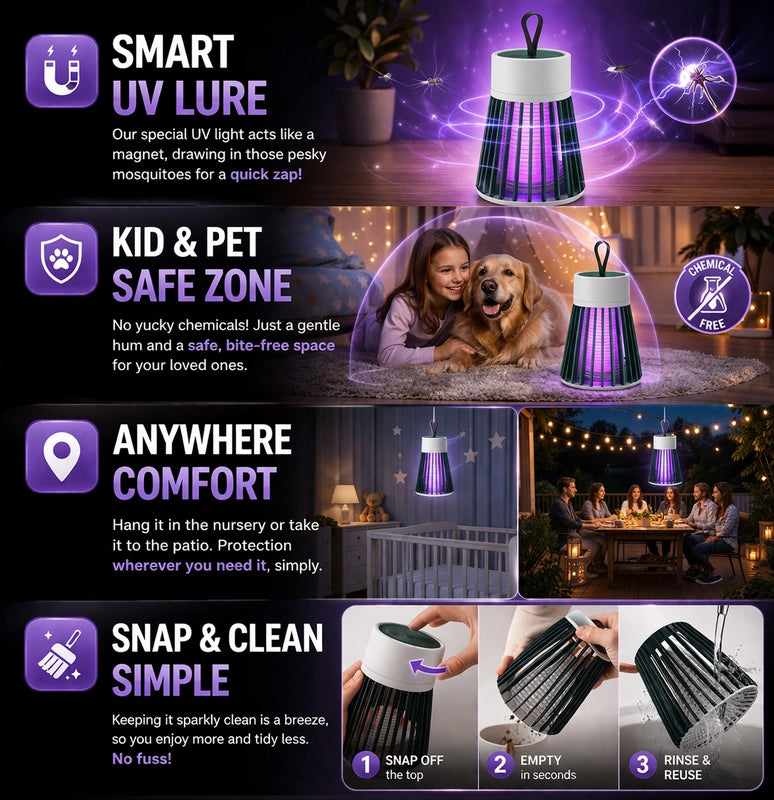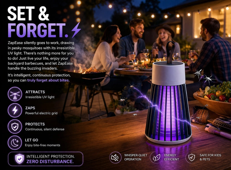 ZapEase uses a powerful, irresistible UV purple light to attract those pesky biters, then zaps them away with a swift, silent electric grid. It's a simple, effective, and completely chemical-free way to keep your space gloriously bite-free, so you can enjoy every moment without interruption.