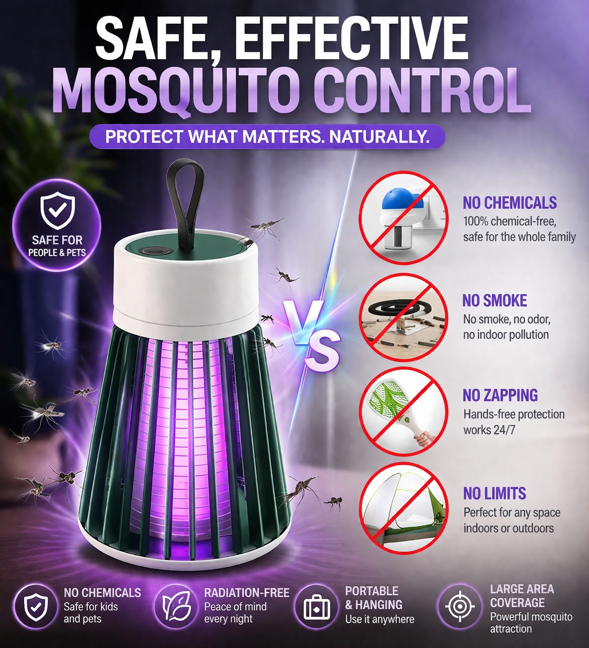 Just plug it in or hang it up! Enjoy mosquito-free zones anywhere, anytime, with zero fuss or complex setup.